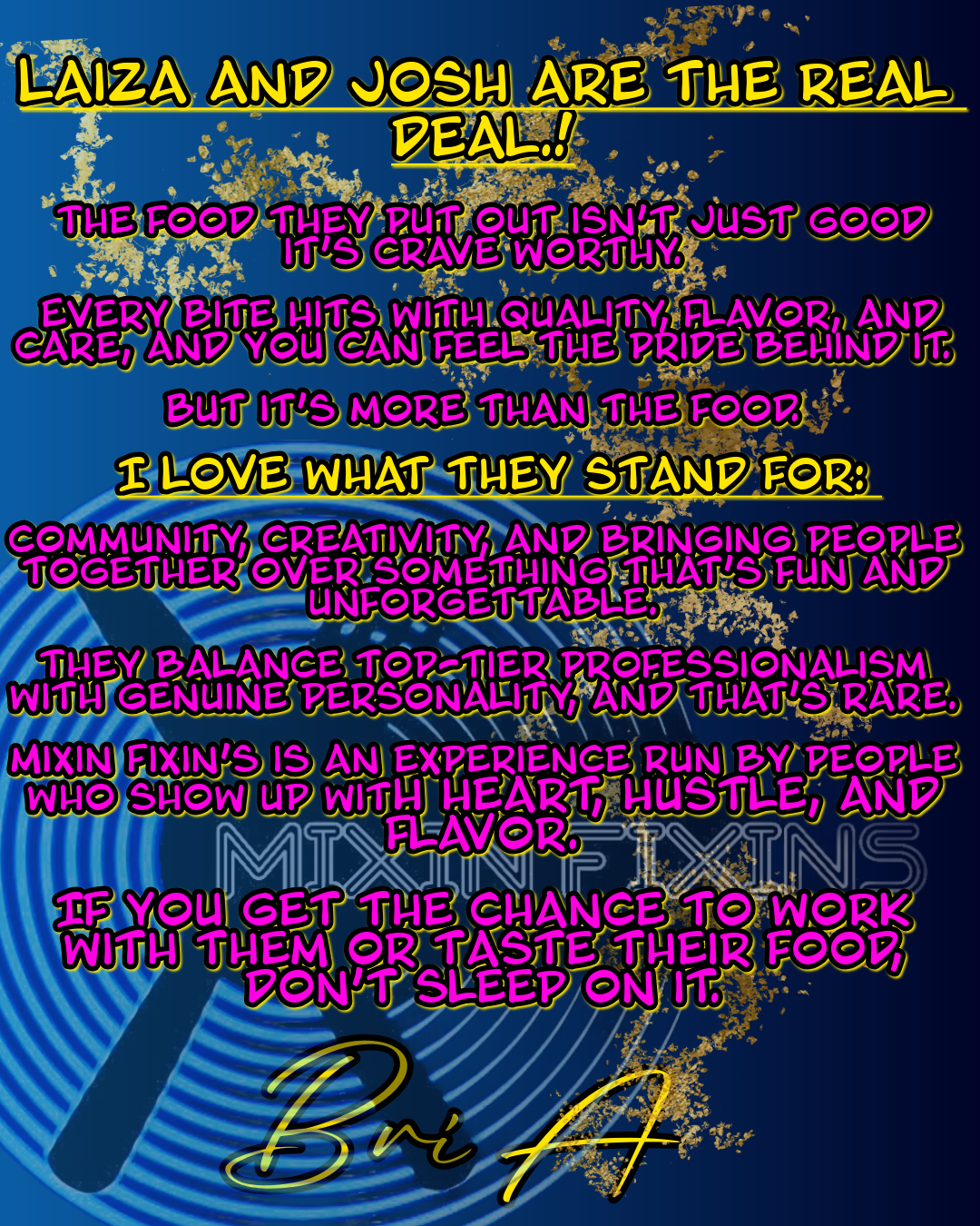 From pop-ups to private events, corporate lunches to block parties, Mixin Fixin’s isn’t just a food option — it’s an experience. One built on creativity, fun, and flavors you can’t get anywhere else.